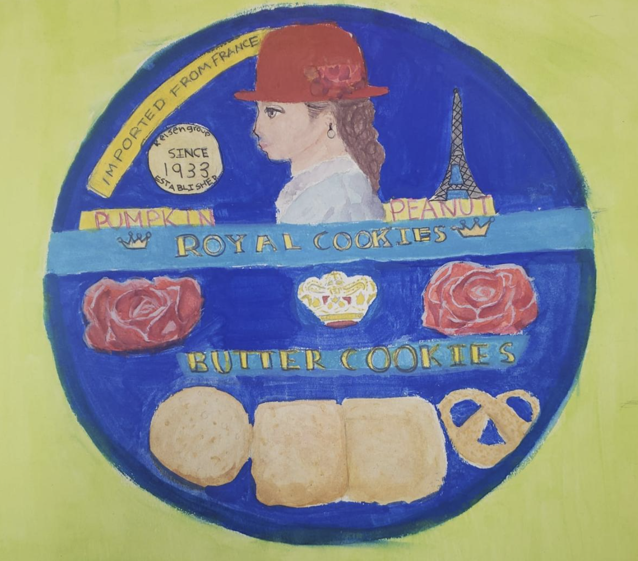 This artwork is a creative design for a butter cookies package, featuring a girl in a red hat against a bright blue background. The design includes the words "Royal Cookies" and "Butter Cookies," emphasizing the treats inside. Elements like the Eiffel Tower add a touch of French flair, suggesting a classic and delightful recipe. The vibrant colors and playful imagery, including cookies and pretzels, make it inviting and fun, capturing the joy of enjoying delicious snacks such as butter cookies.